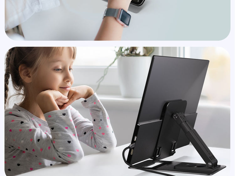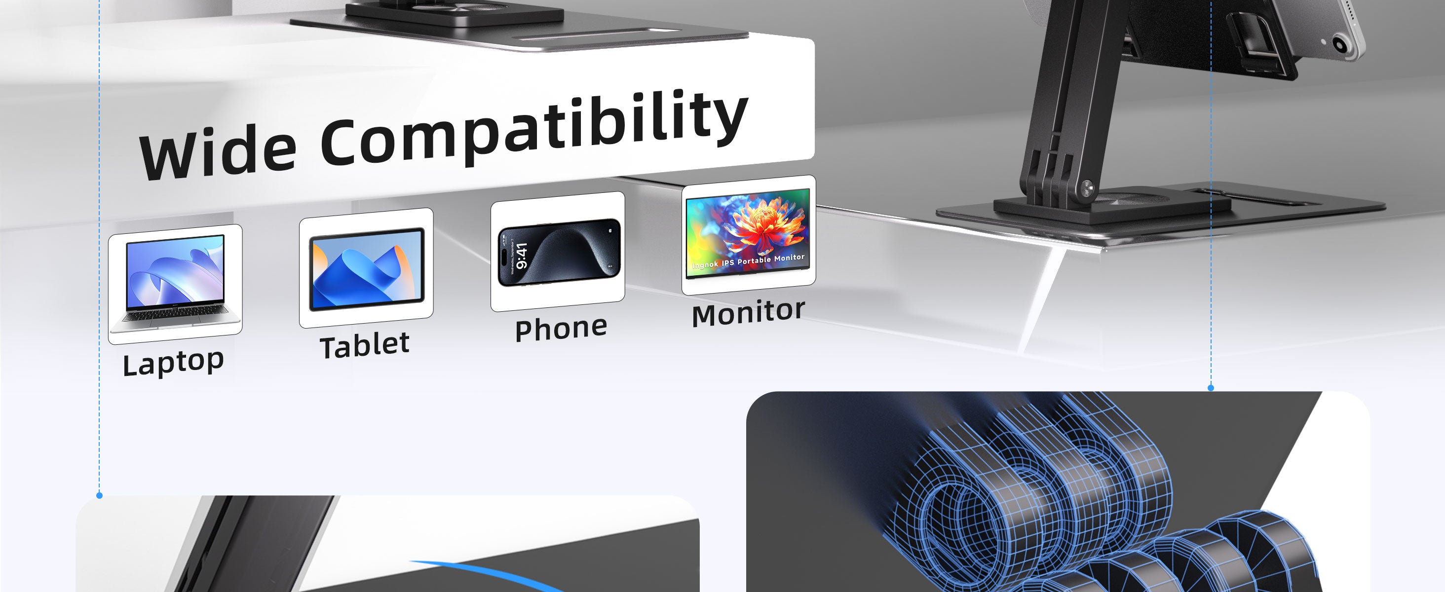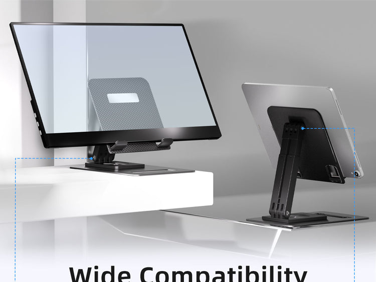 - The high-strength stainless steel base and anti-slip pads ensure a rock-solid, secure hold for devices up to 2.2lb. Its universal design stably accommodates smartphones, tablets, and portable displays, with a dual-foot design for unobstructed charging.