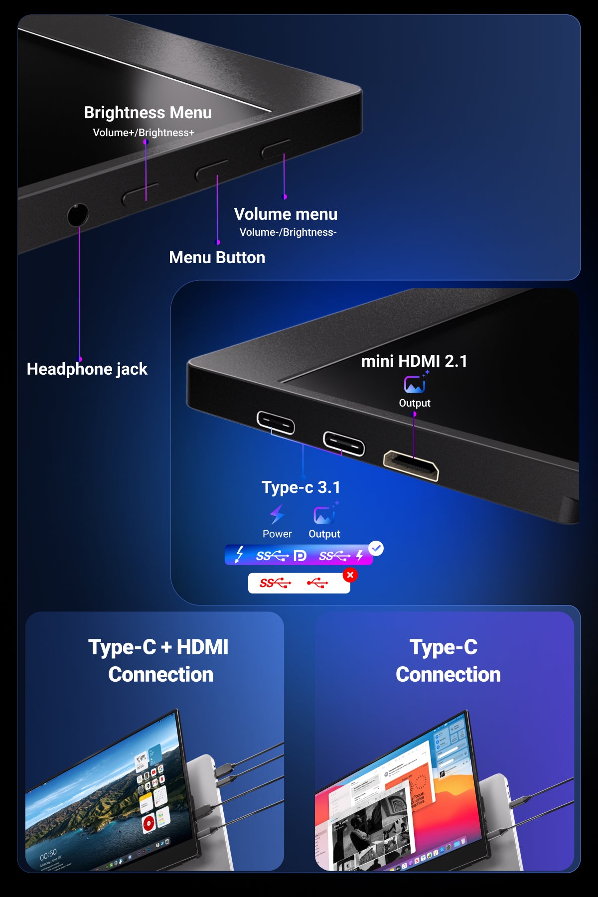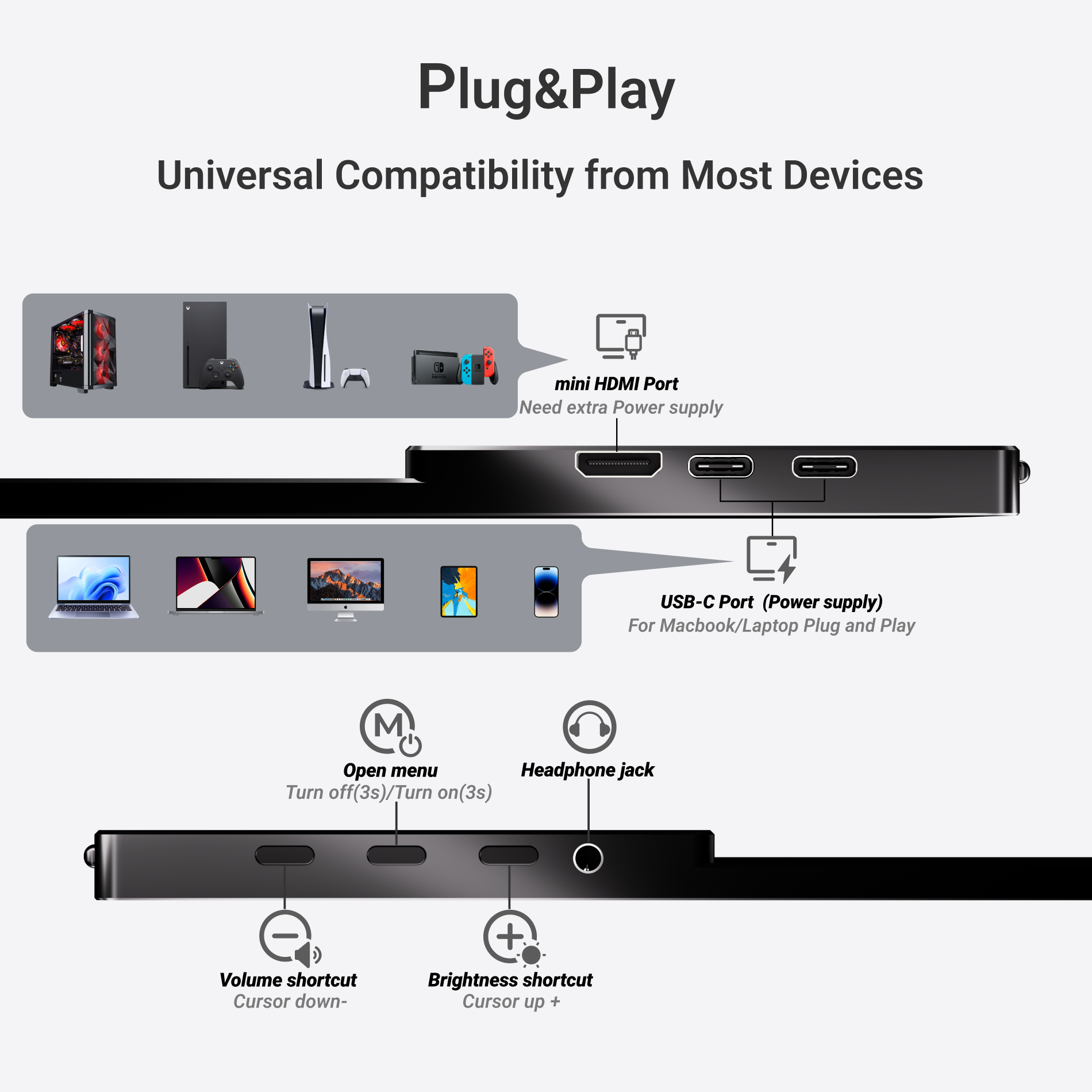 Weighing just 1.98 lbs and 0.43 inches thin, this portable monitor features HDMI, Type-C, and Micro USB ports for effortless plug-and-play use. Compatible with laptops, mini PCs, and consoles, it’s your ideal on-the-go display for work or entertainment.